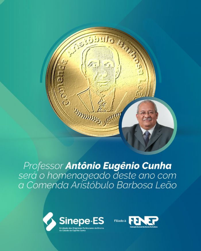O Sinepe/ES tem a honra de anunciar que o professor Antônio Eugênio Cunha será o grande homenageado deste ano com a Comenda Aristóbulo Barbosa Leão, o mais importante reconhecimento do setor educacional privado capixaba.