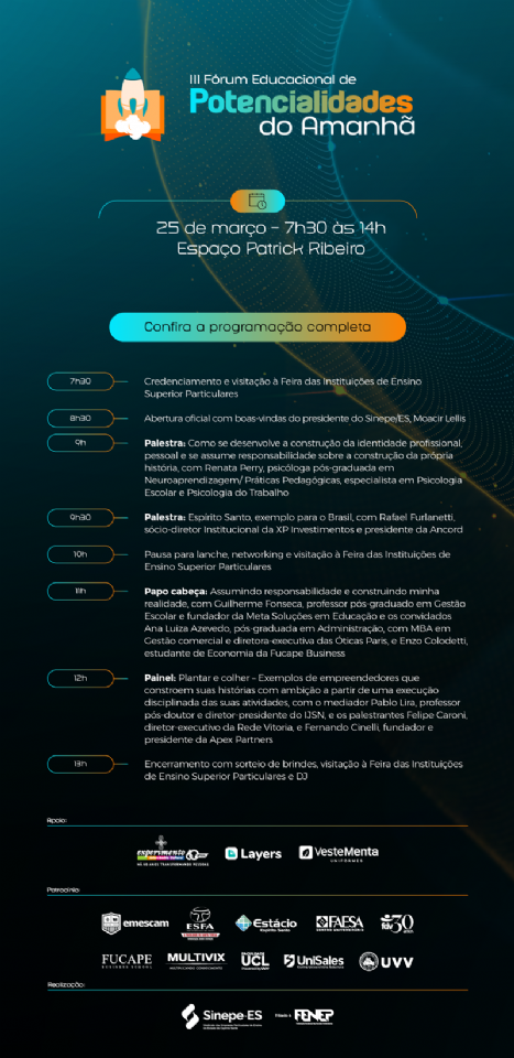 A programação do III Fórum Educacional de Potencialidades do Amanhã acaba de sair e vem com palestrantes de alto nível e conteúdos pensados para inspirar e ampliar a visão de futuro dos estudantes do ensino médio. No dia 25 de março, no Espaço Patrick Ribeiro, em Vitória, os jovens terão contato com temas como identidade profissional, escolhas de carreira, protagonismo juvenil, mercado de trabalho, responsabilidade pessoal e as potencialidades do Espírito Santo.